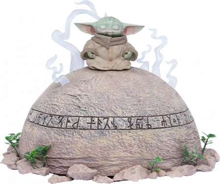 In einem tranceähnlichen Zustand, in dem er Visionen hat oder jemanden oder etwas durch die Macht erreicht, während sich ein Energiefeld um ihn herum bildet, bleibt das kleine Kind, das Grogu (Baby Yoda) genannt wird, auf dem sogenannten Sehenden Stein sitzen. Dieser Stein hat die Form einer Kuppel in den alten Ruinen eines Tempels, auf dessen Boden Runen eingraviert sind, die besagen, dass, wenn ein machtsensibles Wesen auf seiner Spitze meditiert, er ein Energieleuchtfeuer an alle anderen machtsensiblen Wesen in der Nähe sendet. So präsentiert Iron Studios seine Statue “Grogu Legacy Replica 1/4 – The Mandalorian – Iron Studios”, die von dieser ikonischen Szene aus der zweiten Staffel der Serie The Mandalorian, einem Spin-off von Star Wars, abgeleitet ist. Der Mandalorianer ist eine Produktion des Streaming-Kanals Disney+ unter der Regie von Jon Favreau.